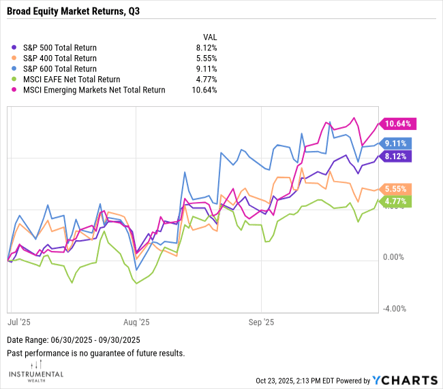 The third quarter of 2025 delivered strong equity performance across the board, with international markets continuing their year-long dominance over US equities. Despite ongoing government shutdown concerns and mixed economic signals, markets demonstrated remarkable resilience through the quarter.