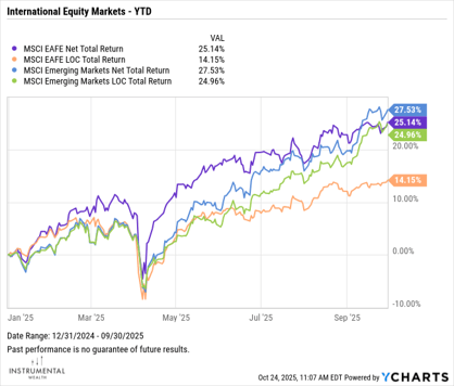 The US dollar's weakness has been a significant tailwind for international returns. After depreciating nearly 10% year-to-date, the dollar provided US investors with an approximate 11% boost to developed market returns and 2.6% to emerging markets. However, the dollar did strengthen slightly in Q3 (up 1%), creating a minor headwind for the quarter.