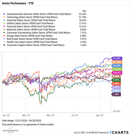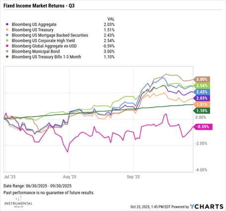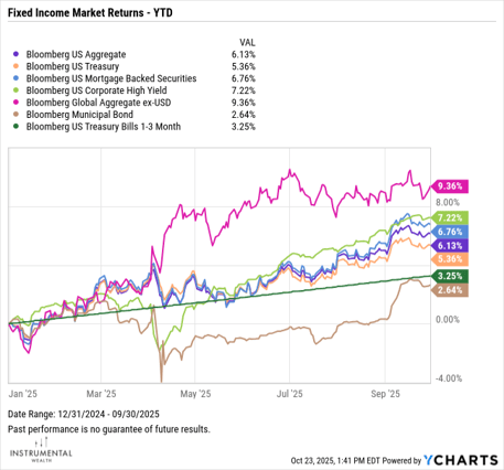 Fixed income continued its solid 2025 performance, with municipal bonds leading Q3 returns at 3%. Year-to-date, the bond market has delivered meaningful returns across all sectors: