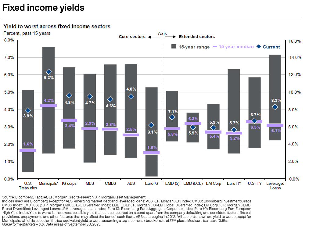 Source: Bloomberg, FactSet, JP Morgan. Yield to worst across fixed income sectors, past 15 years