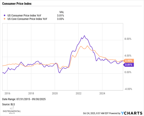 Shelter costs remain the primary inflation driver at 3.5% year-over-year, representing 35% of the CPI index. Gasoline prices, while down 0.5% year-over-year, spiked in August and September, contributing to headline inflation.