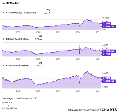 Source: BLS. Job openings, hires, and quits trends through August 2025
