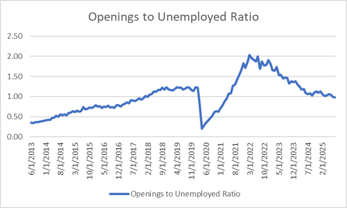 - Job openings per unemployed person: Now below 1.0 for the first time since early 2021