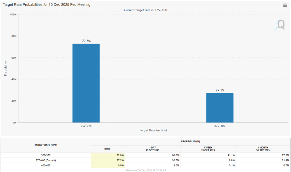 Source: CME Group. Market pricing shows 72.8% probability of 25bp cut