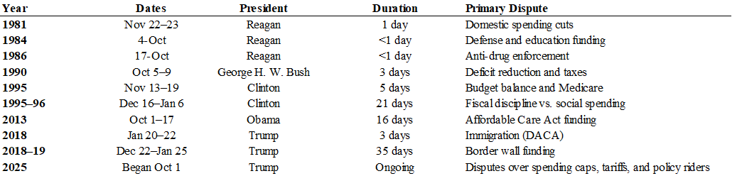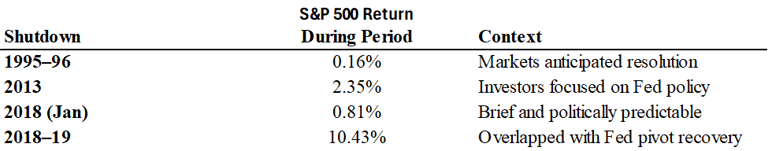 The current government shutdown, now approaching one month in duration, has created data gaps and operational disruptions but minimal market impact. Historical precedent shows why: