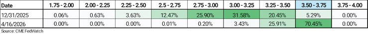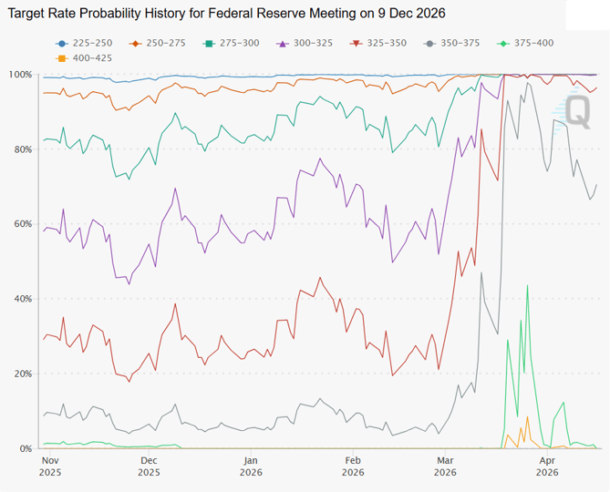 Source: CME FedWatch. Target rate probabilities for the December 9, 2026, Federal Reserve meeting. Data as of April 16, 2026.